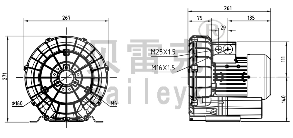 最大風量:100m3/h 最大正壓:150mbar 最大負壓:150mbar 防護等級:IP55 噪音:55db 重量:12Kg